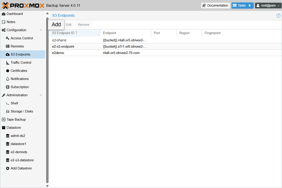 - Select S3 Endpoints under Configuration and then click Add to add your IDrive e2 cloud as a new S3 Endpoint.