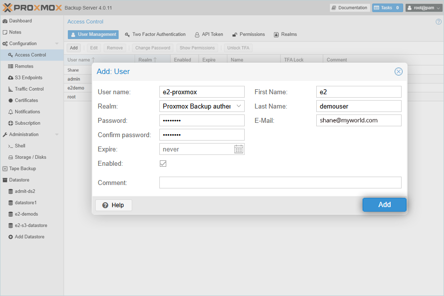 - In the Add: Proxmox Backup Server popup, enter details as mentioned below.