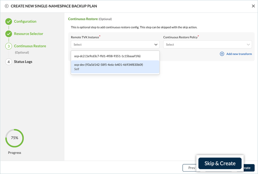 - On the next screen, you can enable Continuous Restore to reduce RTO by pre-staging volumes to a remote cluster.