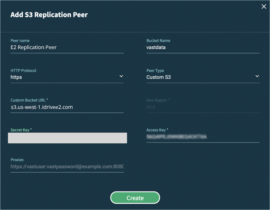 - In the Add S3 Replication Peer window, select Custom S3 as the Peer Type and provide the following details. Click Create.