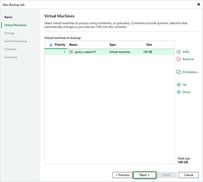 - Click the Add in Virtual Machines tab to select the Proxmox virtual machine for backup.